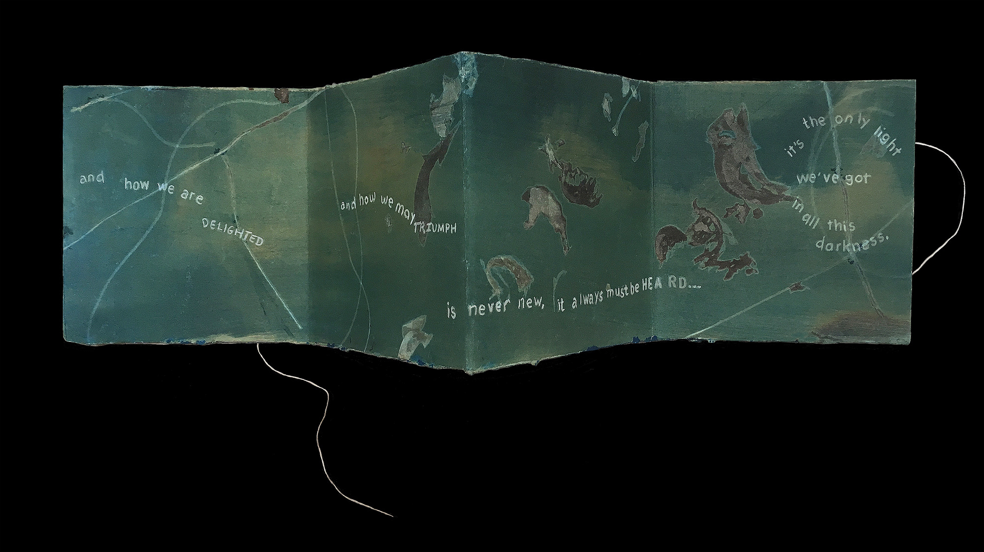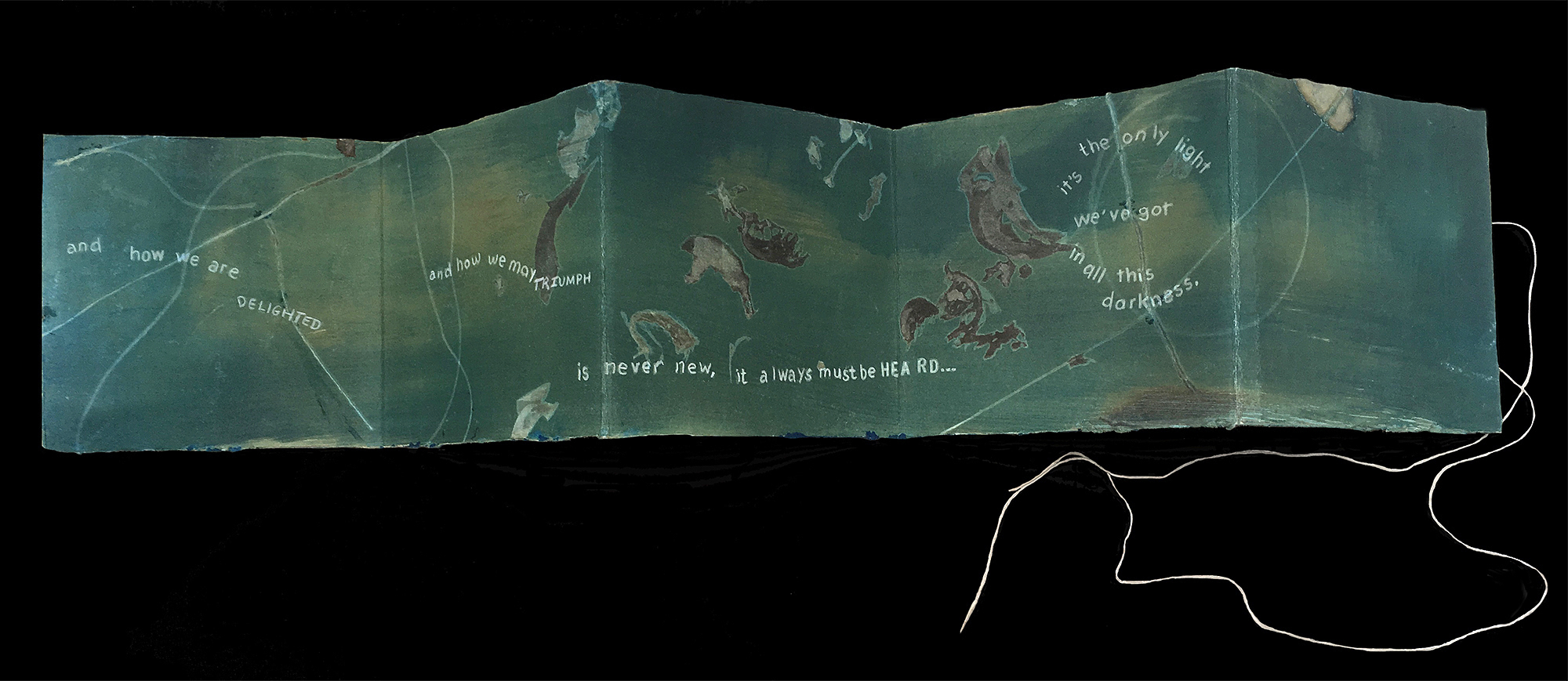 Words in my one-of-a-kind cyanotype and VanDyke brown print book are from a short story by James Baldwin, U.S. novelist, playwright, essayist, poet, brilliant thinker, and activist. “The tale of how we suffer and how we are delighted and how we may triumph is never new, it always must be heard…it’s the only light we’ve got in all this darkness.”